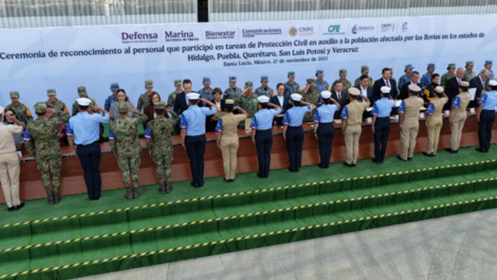 Desde el Centro Estratégico Militar de Acopio, la presidenta de México, Claudia Sheinbaum, reconoció a personal militar, naval y servidores públicos que participaron en la aplicación del Plan DN-III-E y Plan Marina en Hidalgo, Puebla, Querétaro, San Luis Potosí y Veracruz, tras las intensas lluvias de octubre. “Gracias por ser el rostro más noble de […]
