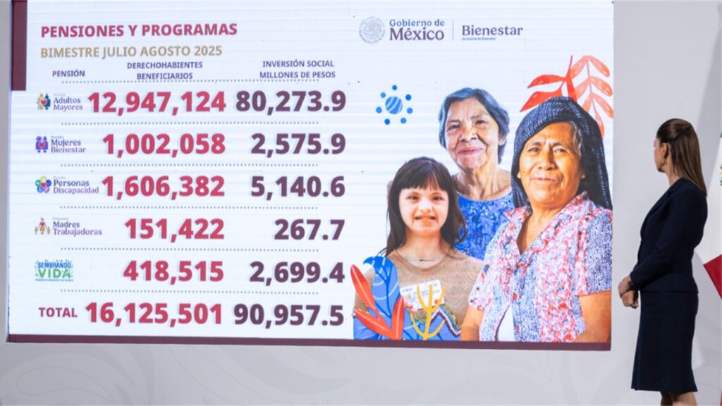 Por su parte, la secretaria de Bienestar, Ariadna Montiel, explicó los avances en materia de programas sociales. Al bimestre julio-agosto de 2025 hay 12 millones 947 mil 124 beneficiarios de la pensión para Adultos Mayores.