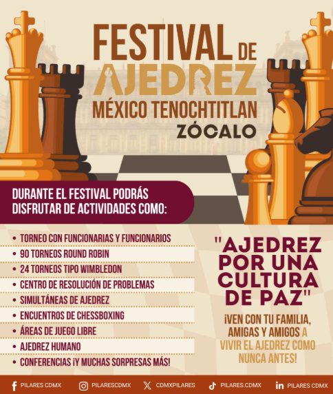 La Secretaría de Cultura capitalina y PILARES invitan a la ciudadanía a disfrutar del Festival del Ajedrez México Tenochtitlan, este domingo 20 de julio a partir de las 9:30 horas, en la Plancha del Zócalo de la Ciudad de México.
