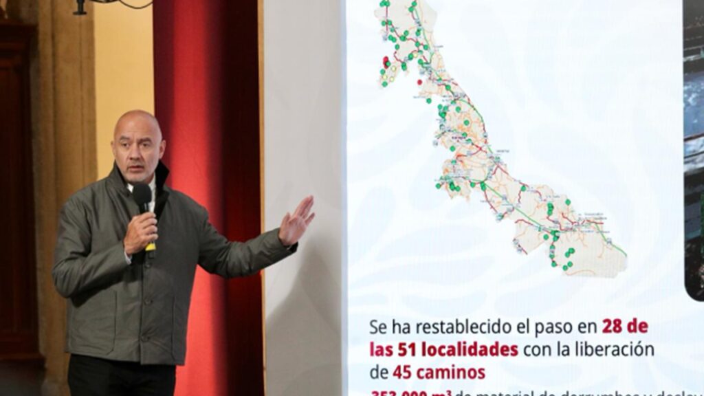 Durante la conferencia matutina “Las mañaneras del pueblo”, encabezada por la presidenta Claudia Sheinbaum Pardo, el titular de la Secretaría de Infraestructura, Comunicaciones y Transportes (SICT), Jesús Antonio Esteva Medina, informó que se han liberado 360 caminos, lo que ha permitido restablecer la comunicación en 202 localidades afectadas por las lluvias extraordinarias.