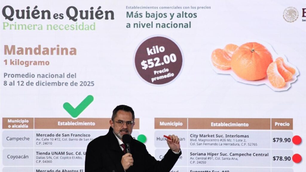 Los precios fueron recabados entre el 8 y 11 de diciembre de 2025. Además, se destacó el monitoreo de la mandarina, cuyo precio promedio nacional fue de $52 pesos/kg, con rangos desde $20 a $29 pesos en los más bajos y hasta $74.99 a $79.90 pesos en los más altos.