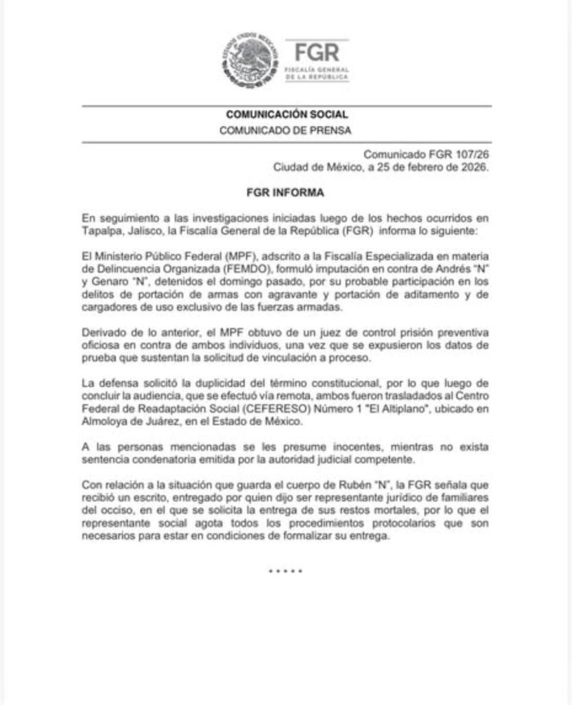 La Fiscalía General de la República (FGR) informó que los familiares de Nemesio Oseguera Cervantes, alias “El Mencho”, solicitaron la entrega de su cuerpo mediante su representante jurídico. La dependencia precisó que la petición se encuentra en trámite y será atendida conforme a los protocolos legales y administrativos aplicables.