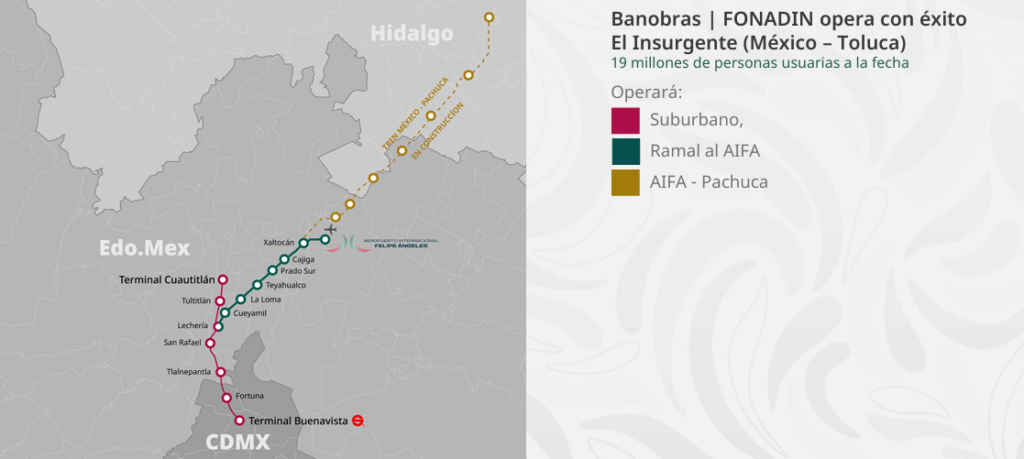 El Tren Suburbano, en operación desde 2008, cubre la ruta Buenavista–Cuautitlán, con 27 kilómetros de extensión y siete estaciones, conectando el centro de la Ciudad de México con el norte del Estado de México. Tan solo en 2025, el sistema transportó 45.1 millones de personas usuarias. Desde su inicio, el Gobierno de México ha destinado una inversión de 13 mil 701 millones de pesos, con apoyo del FONADIN y financiamiento de Banobras.